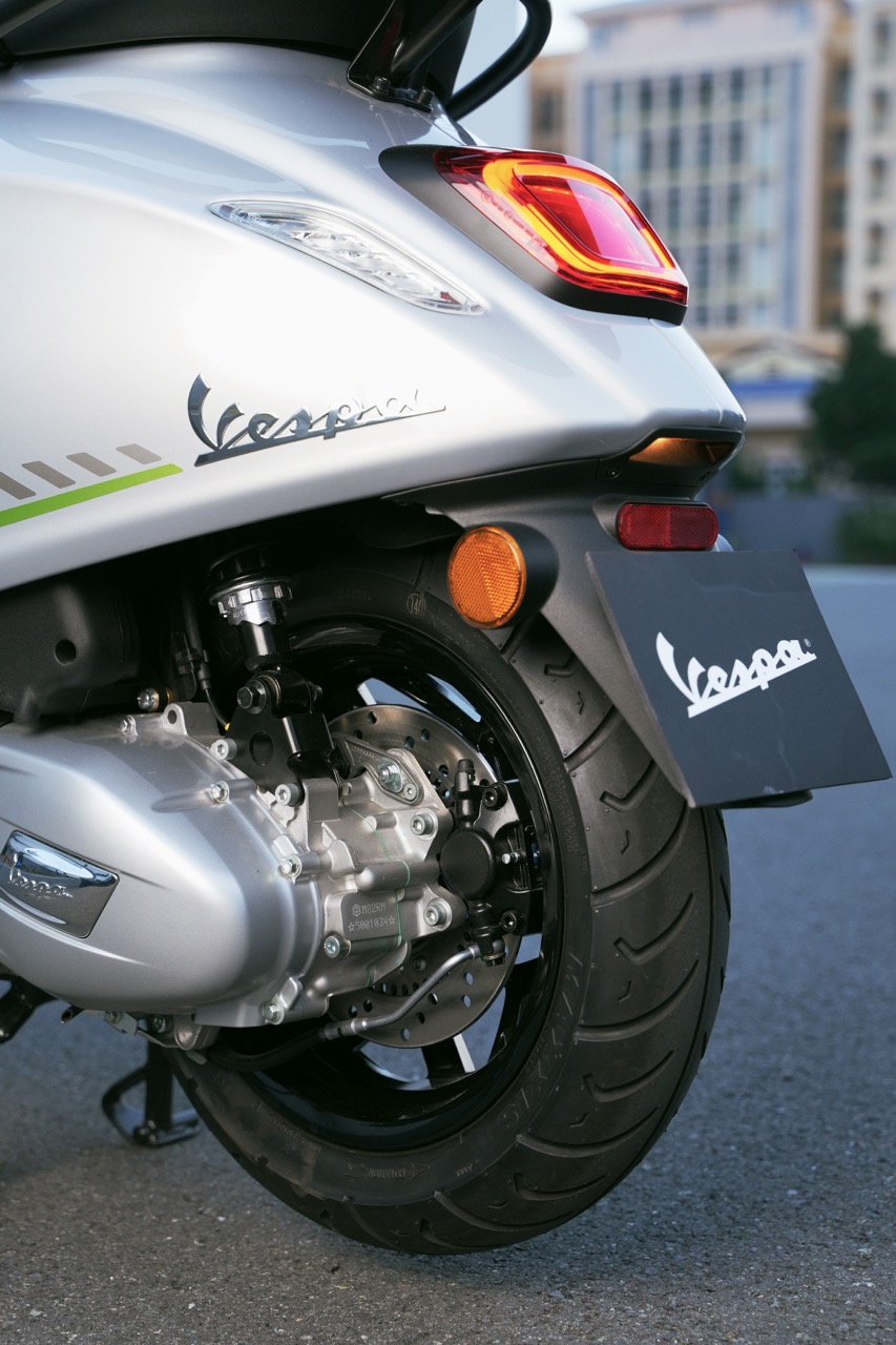 Handling and safety are supported by a single-arm front suspension with a helical spring and hydraulic shock absorber, while the rear uses a helical spring with 4-position adjustable preload. Braking is handled by a 200 mm front disc with ABS, and either a 140 mm drum (single-channel ABS) or 200 mm disc brake (dual-channel ABS) at the rear. The Sprint Tech rides on 110/70-12” front and 120/70-12” rear tubeless tyres.