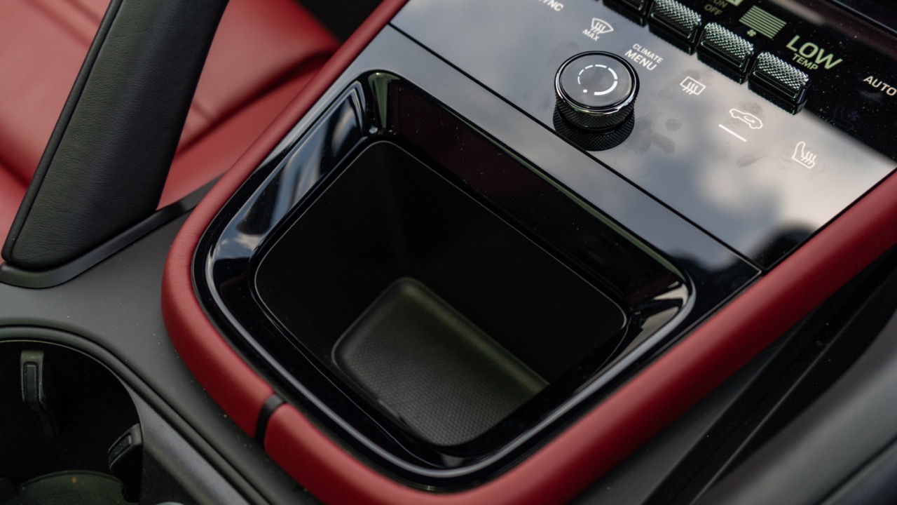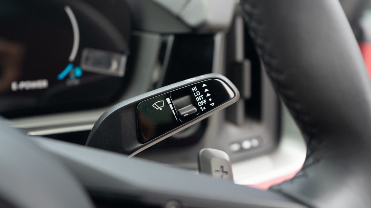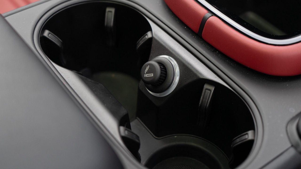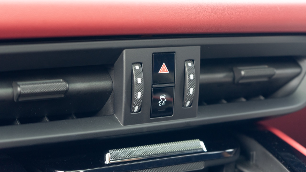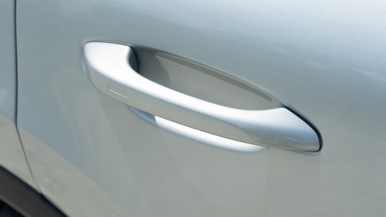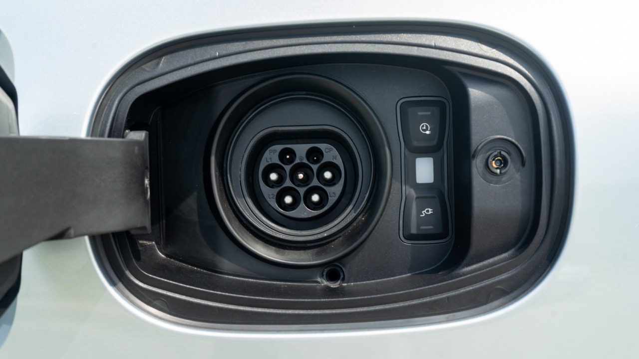 • The (AC-only) EV charge port on the left pops open with a press, while the fuel filler door on the right requires a press on the release switch on the driver’s side window panel.