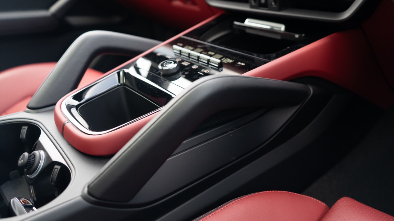 • Storage solutions in the Cayenne are a somewhat mixed bag: the trapezoidal centre console bin can’t really hold much, the shallow drawer beneath the rear air vents isn’t very useful, and the nets on the front seatbacks feel too shallow.