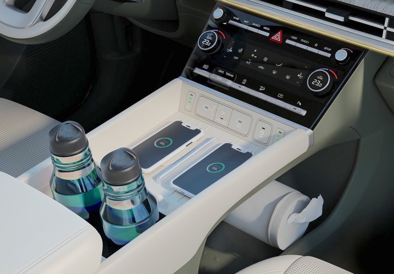 The all-new Hyundai Santa Fe’s interior refinement is exemplified by a variety of high-tech features, including a Panoramic Curved Display and dual wireless charging. The curved display connects the 12.3-inch digital cluster and infotainment system and enhances driver visibility while delivering a sense of luxury.