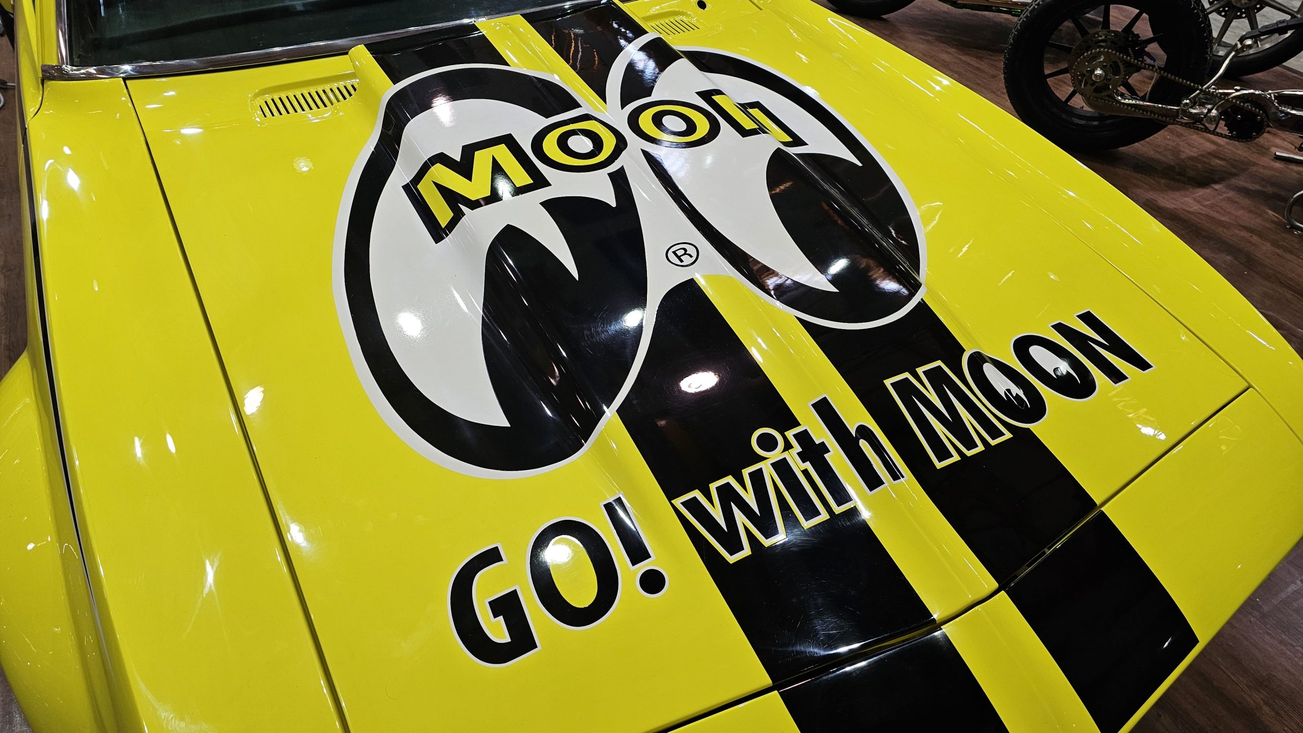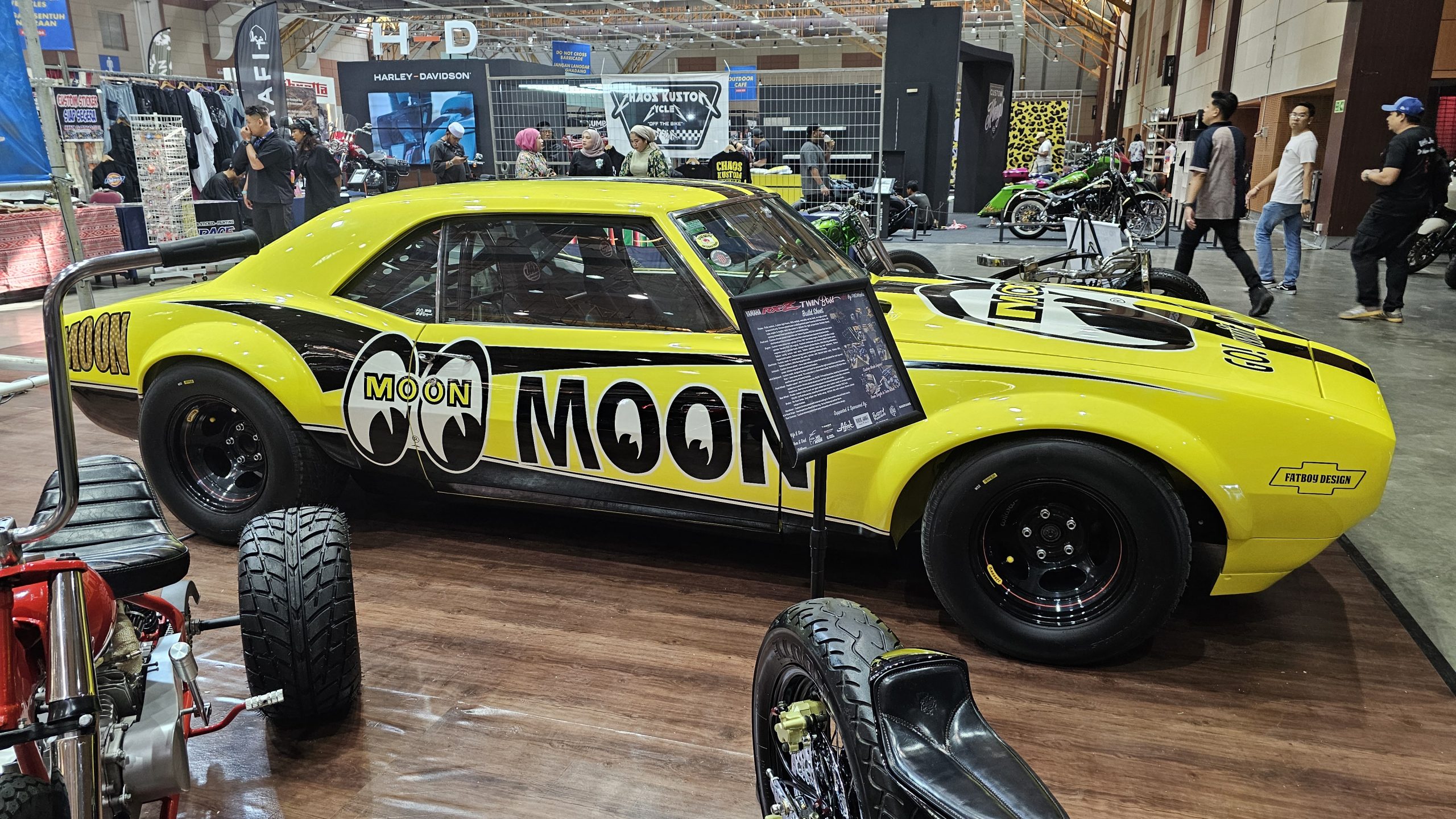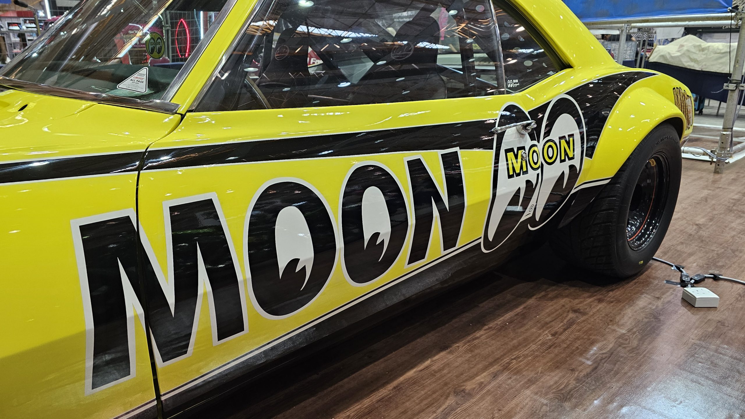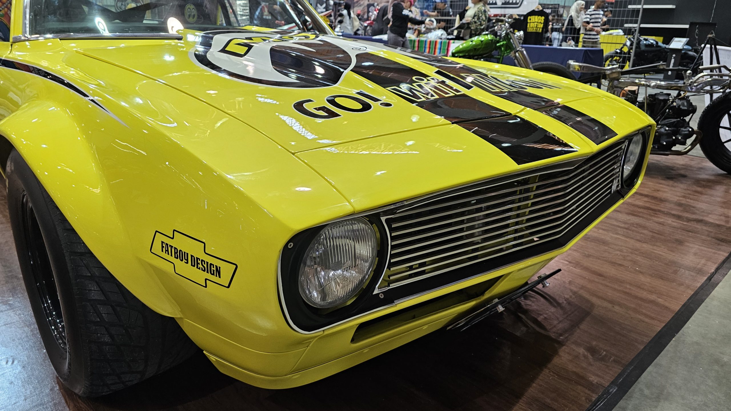 The first thing that greets you at the door of Hall A is a vibrantly yellow classic Chevrolet Camaro all done up in the Mooneyes livery.