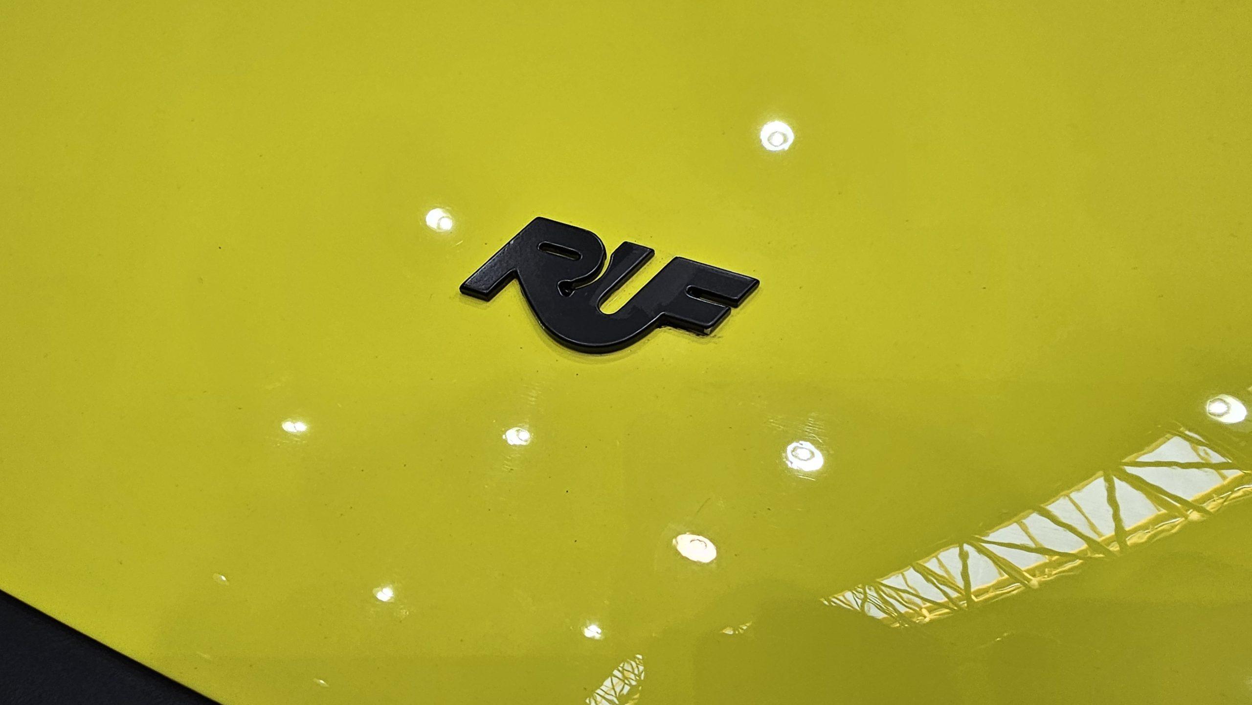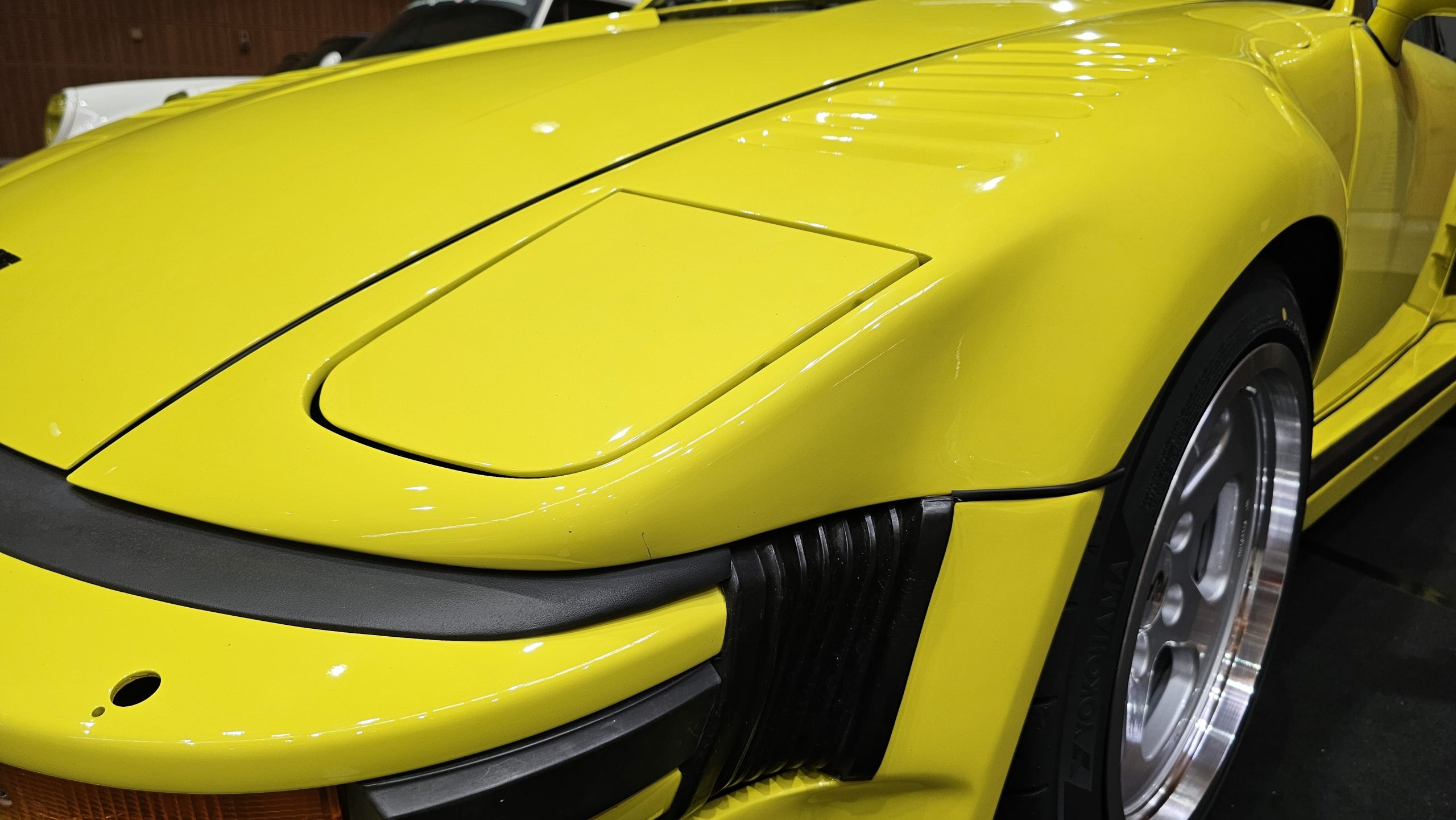 A row of Porsche 930 911s, with the vibrantly yellow RUF-badged flat nose featuring a pack of turbos poking out from beneath the whale tail round its rump!
