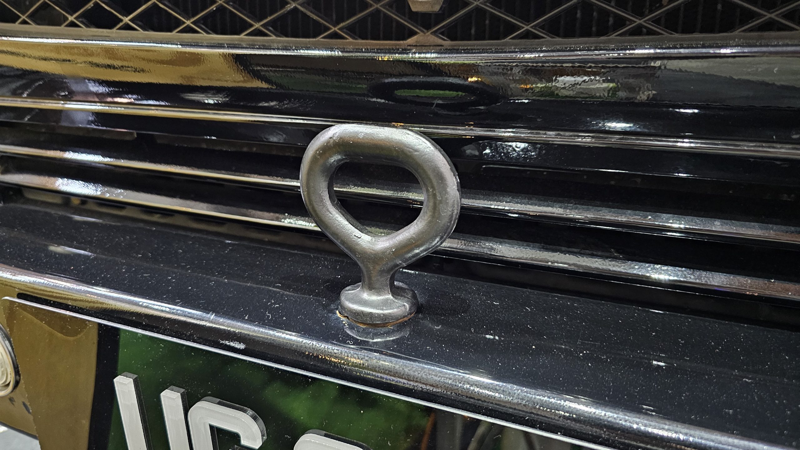 An early small rear light Volkswagen Beetle, riding on Porsche Fuch alloys and lowered to have its chromed bumpers nearly kiss the ground.