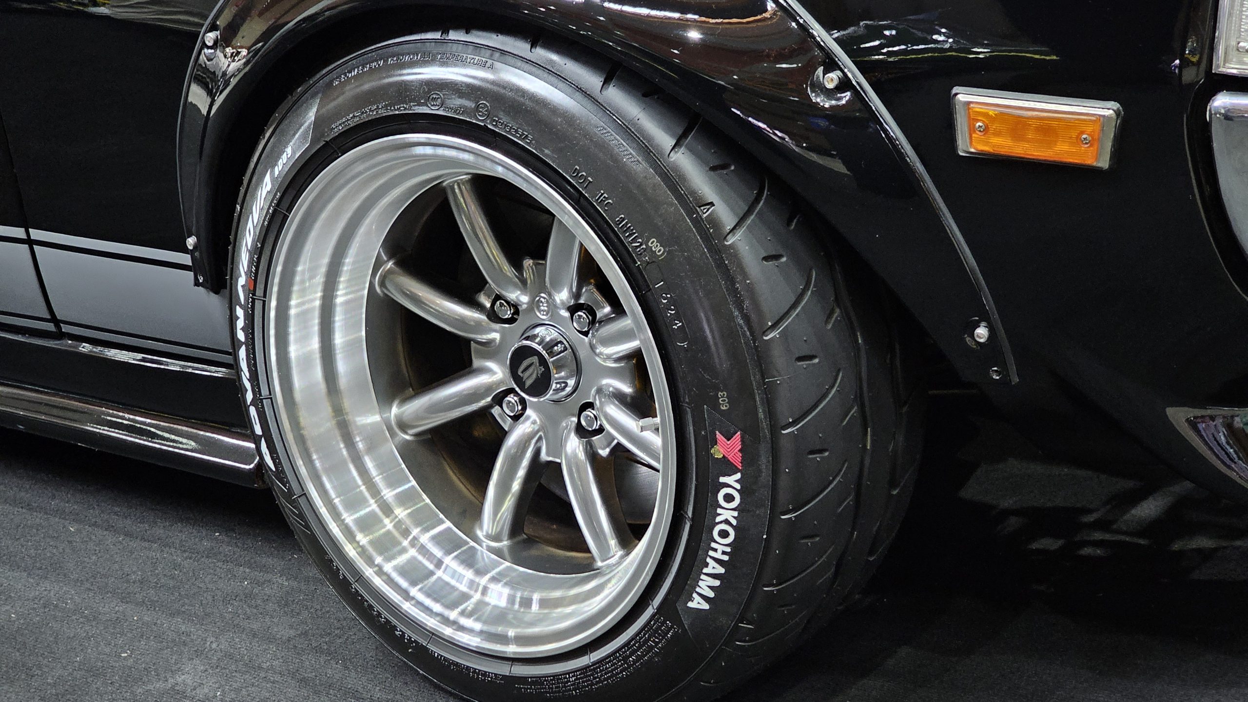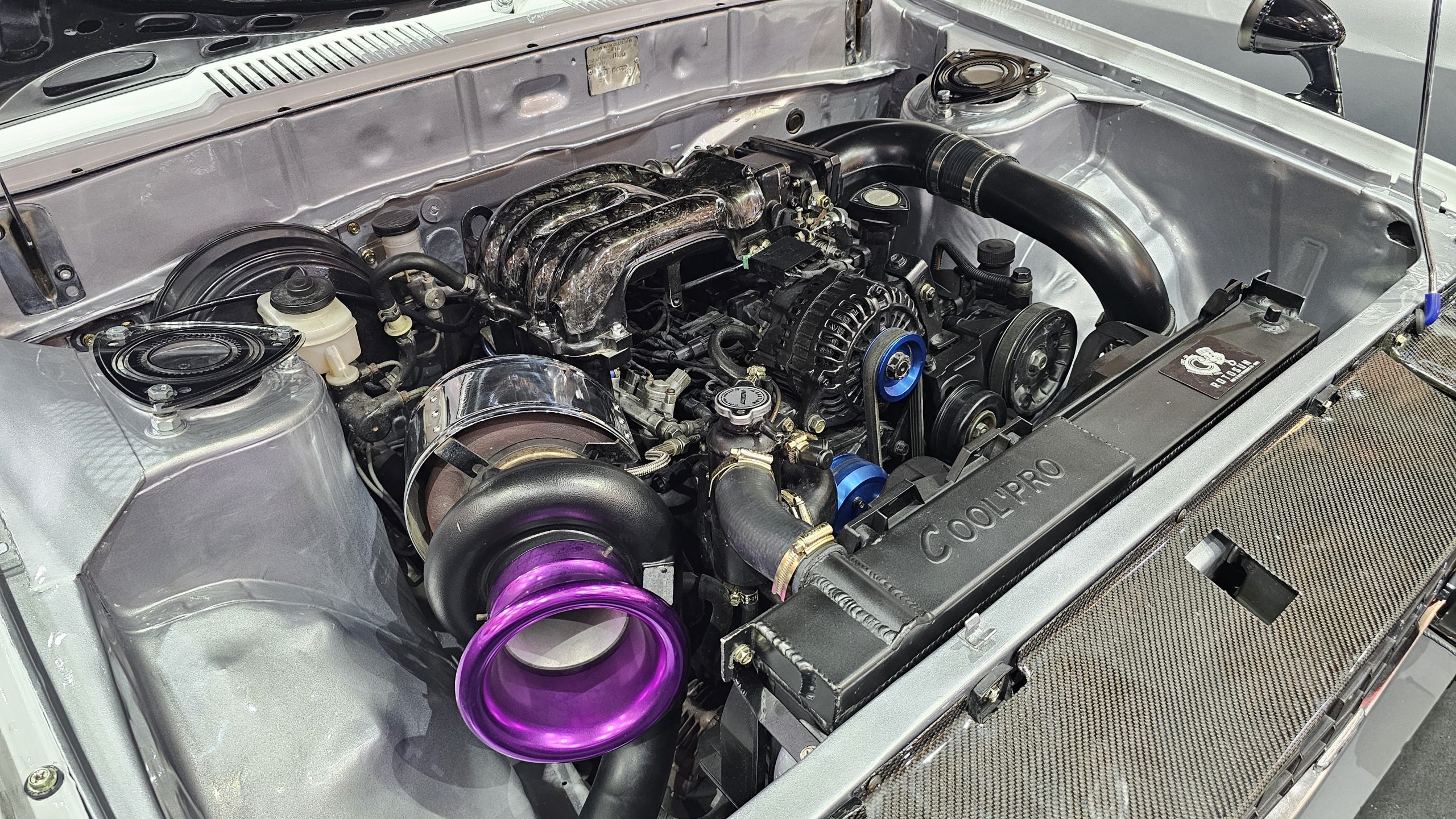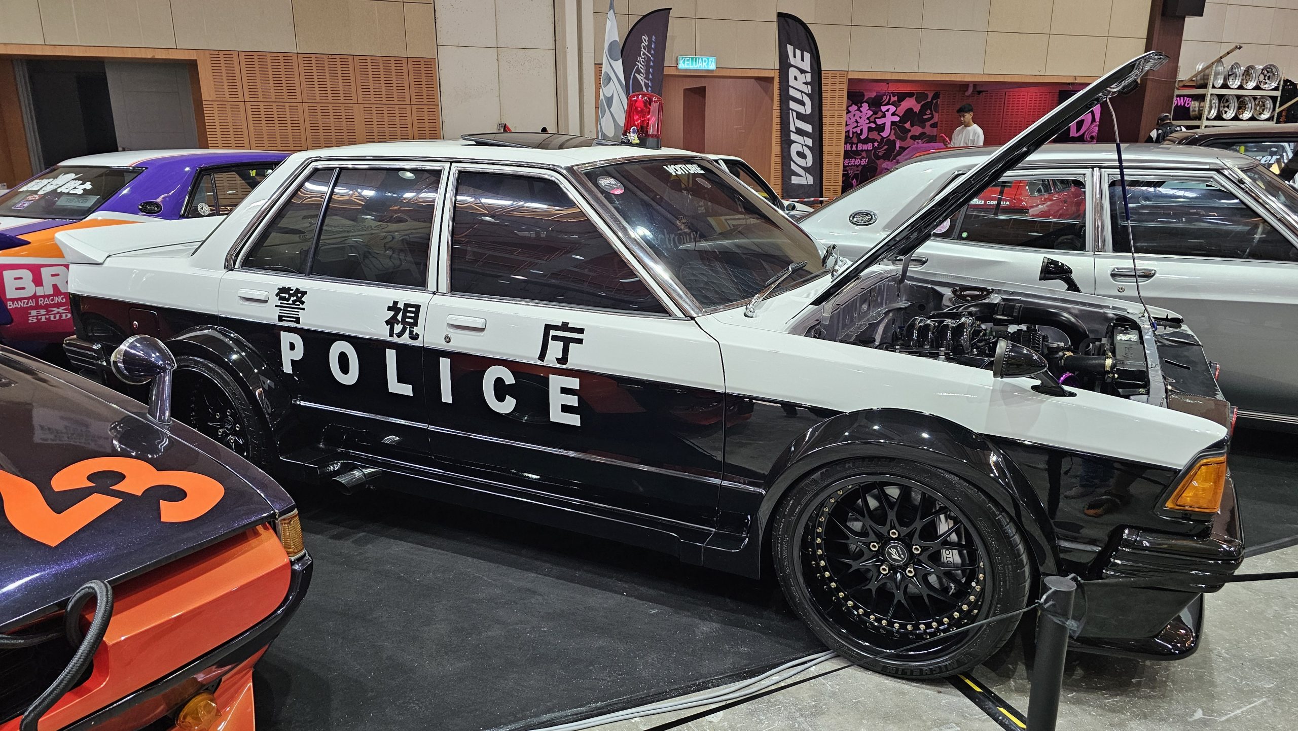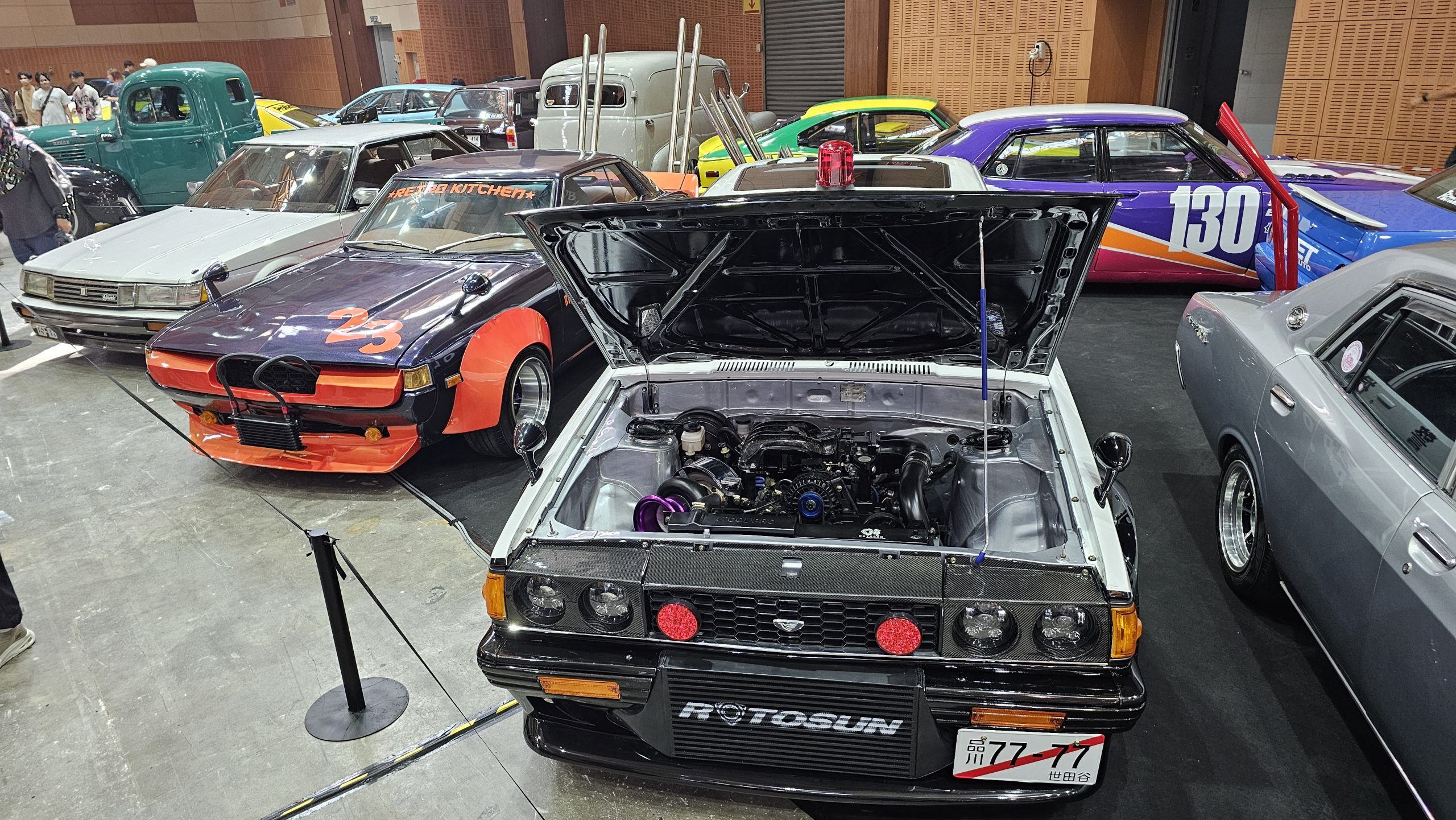 The 77-77 on the Japanese plate and the Rotosun are to be clear hints to the 13B rotary motor that powers this police-liveried Nissan sedan. The plastic rotor that have been screwed atop the strut towers are a nice touch too.