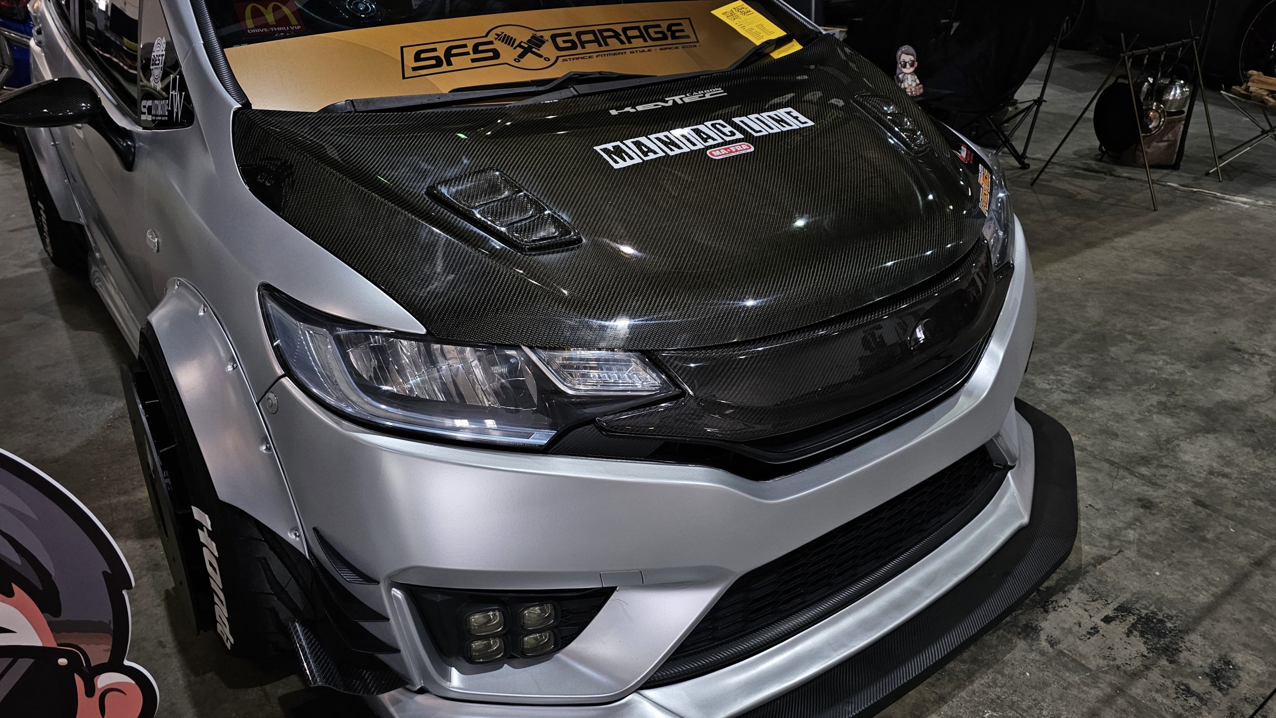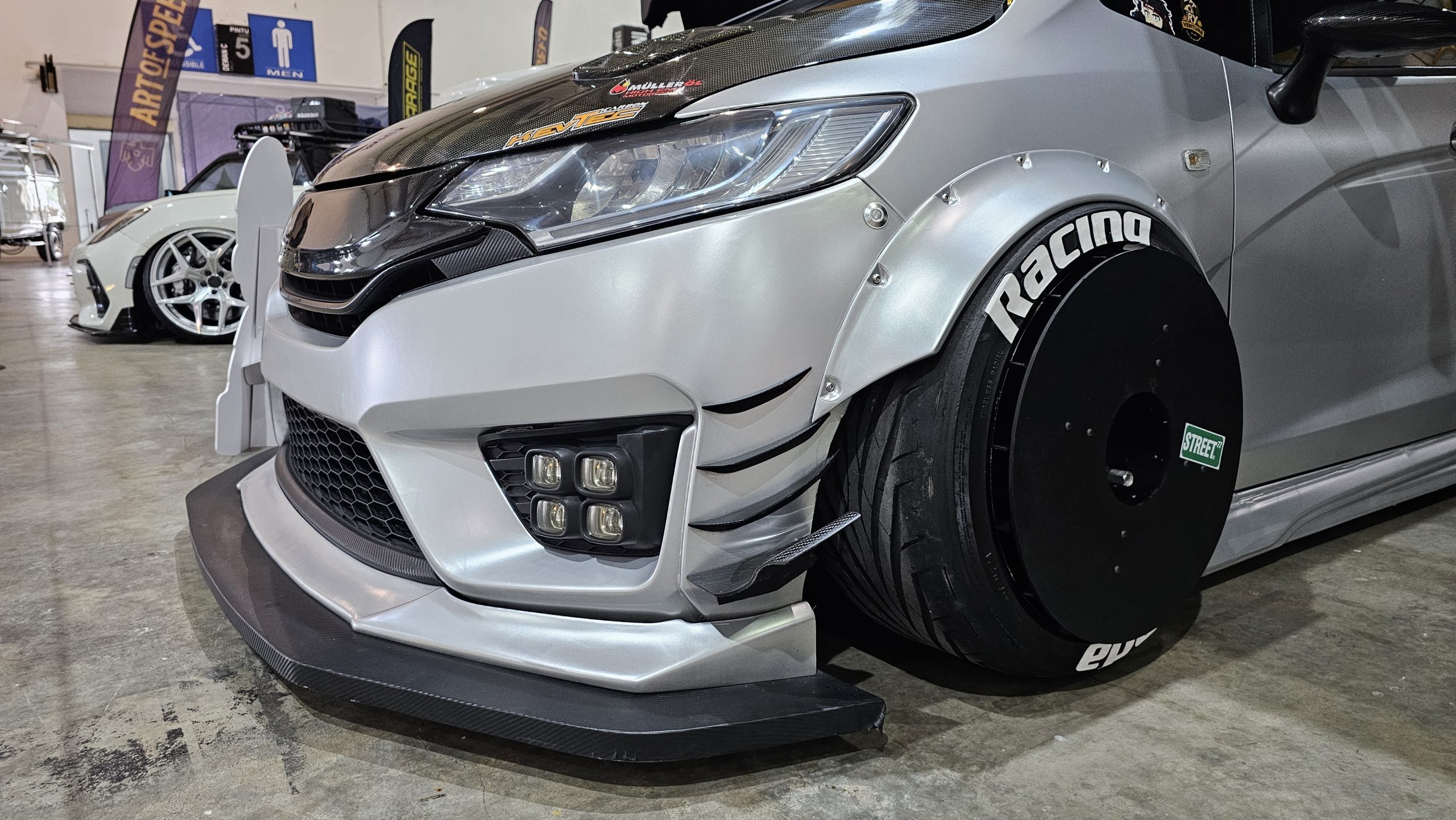 A Honda Jazz with a massive splitter up front, aerodisks and flared fenders down the side, and a roof tent up above. For when you want a racer and camper all in one car.