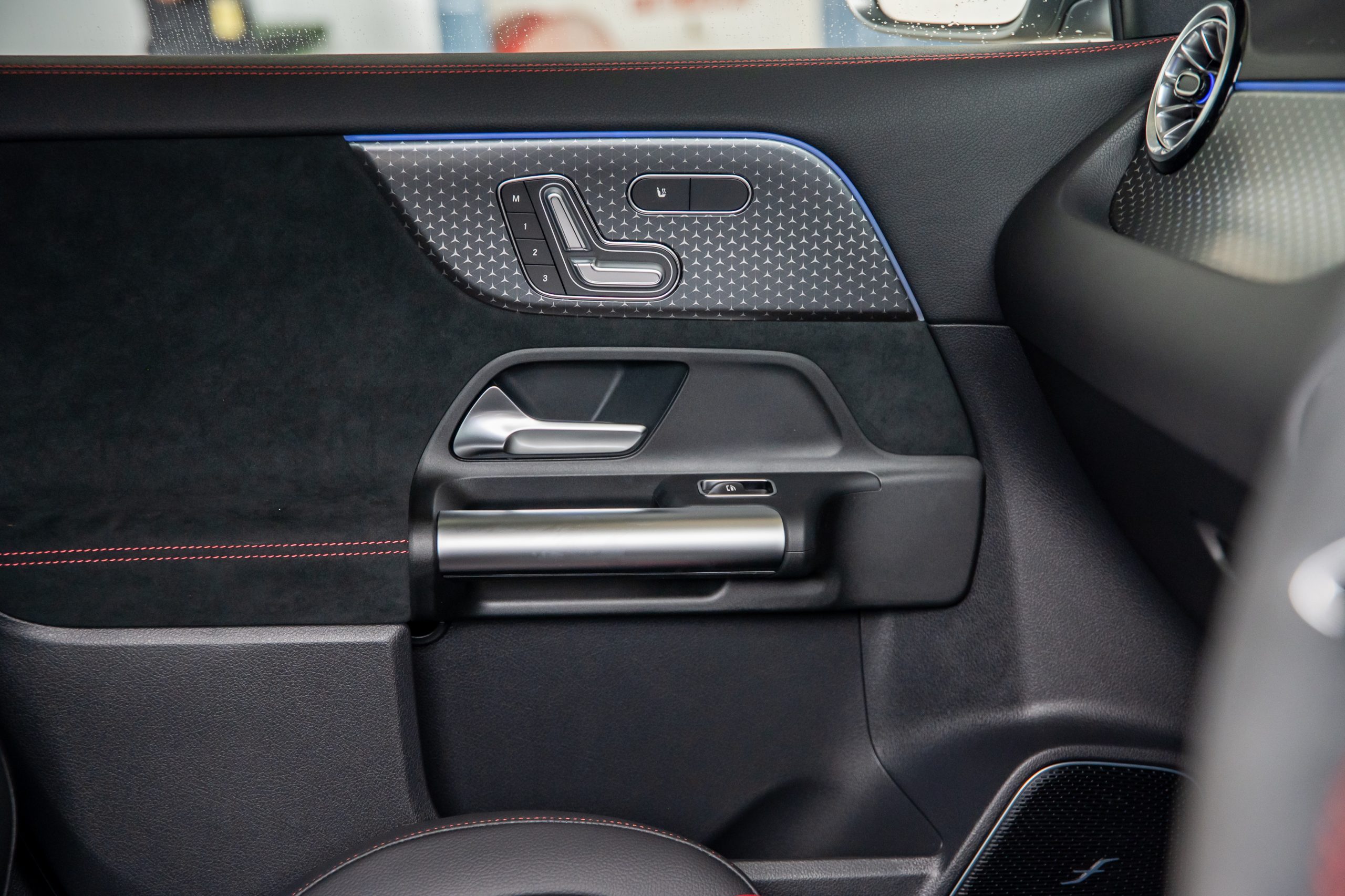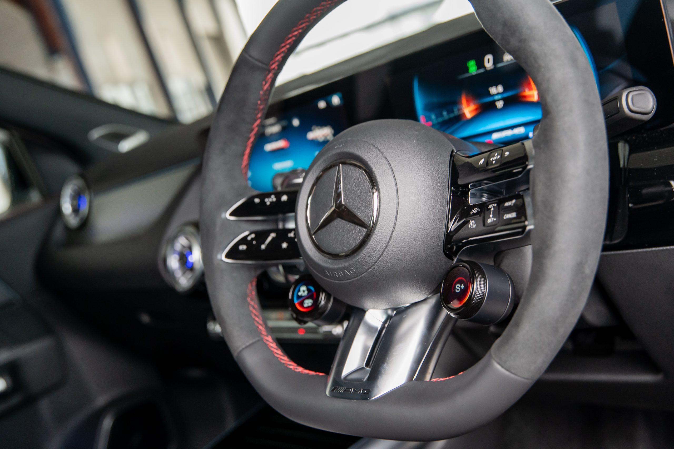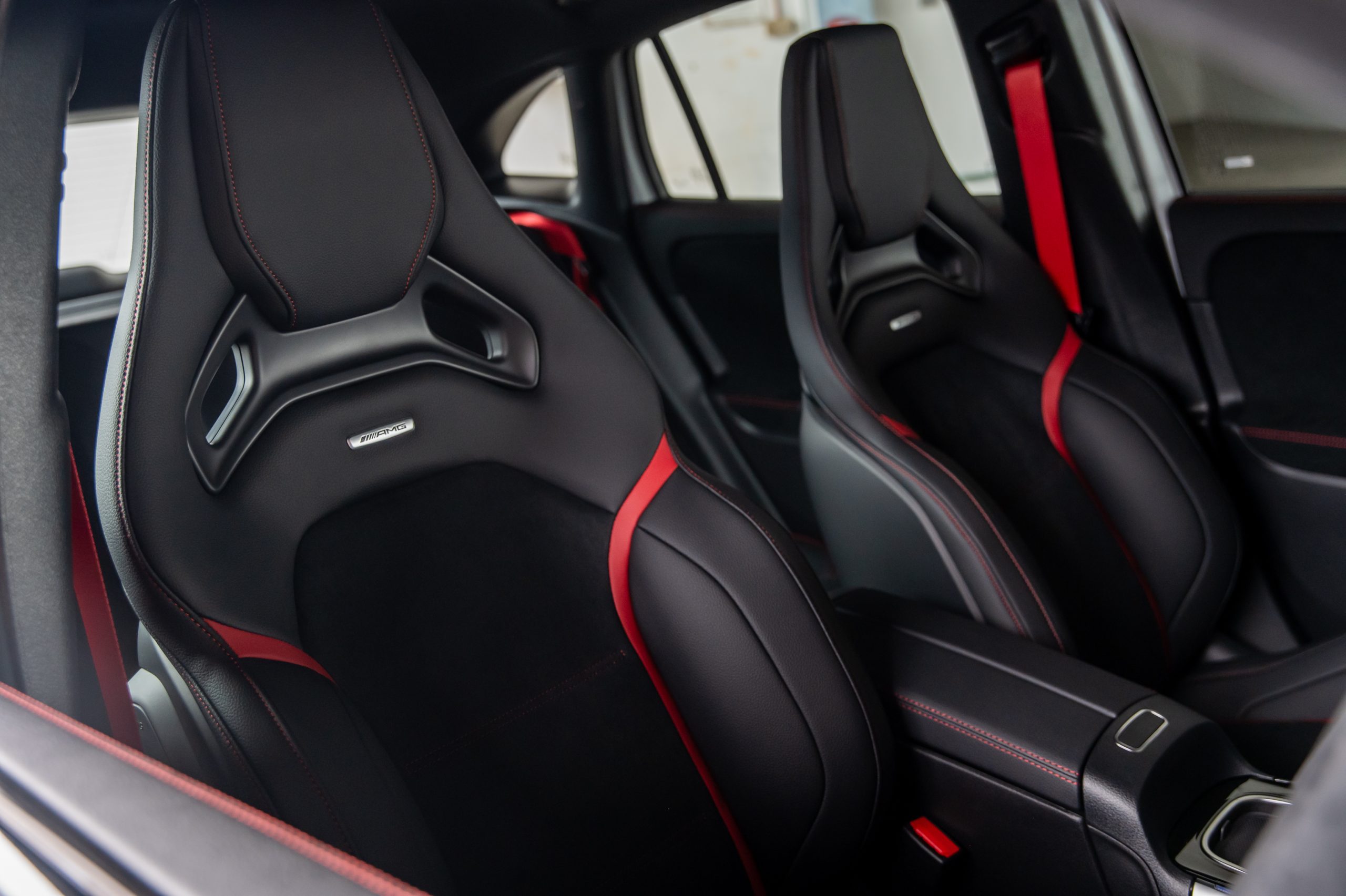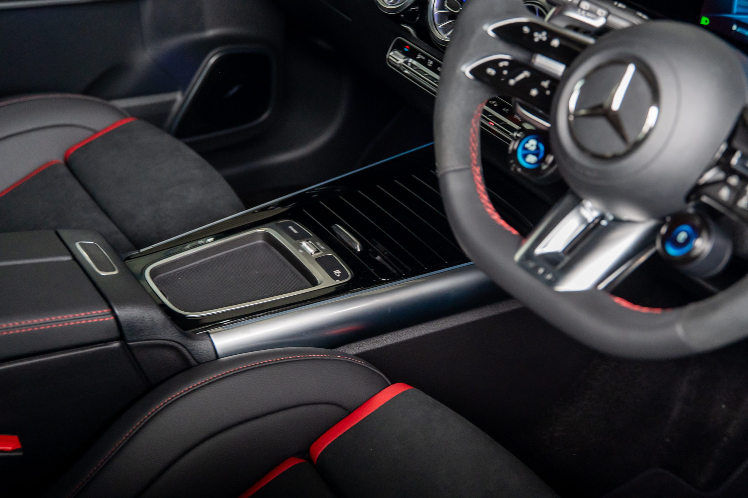 Moving on within, the sensation of sportiness in this updated GLA 45’s interior comes by way of the latest generation of the AMG Performance steering wheel in Nappa leather/MICROCUT microfibre and a pair of AMG Performance front seats upholstered with ARTICO man-made leather/MICROCUT microfibre. This is then further enhanced through with some sporty red seat belts, before being finished off by AMG floor mats and illuminated AMG door sills.