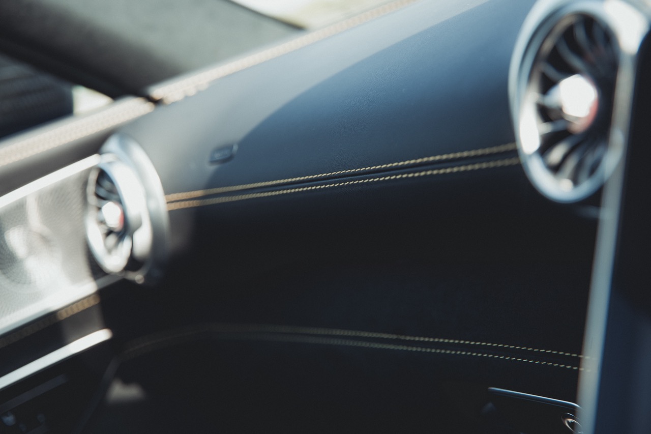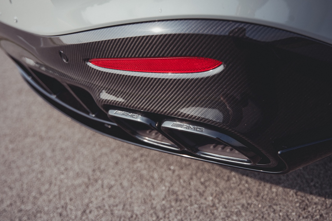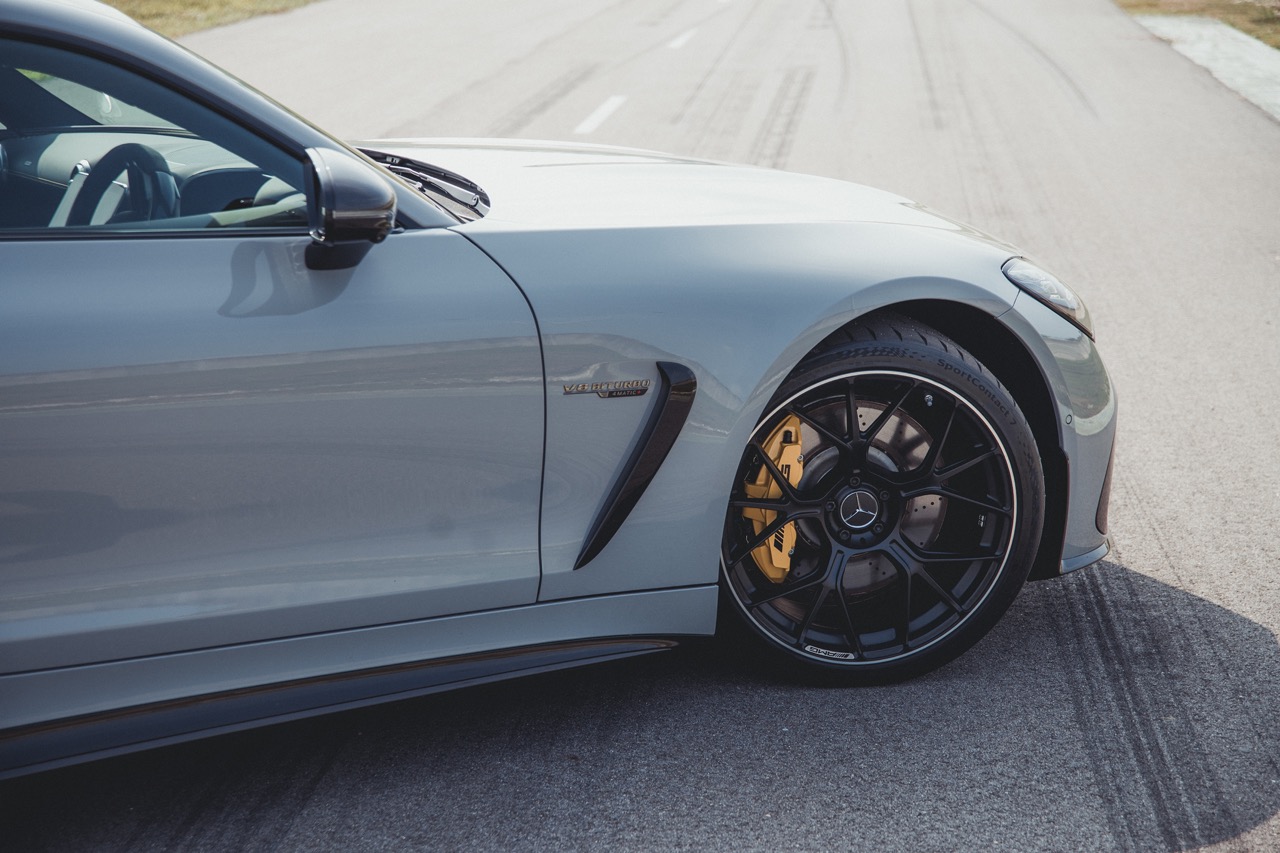 One standout exterior feature that incidentally remains completely hidden from view is the two-part, active air control system AIRPANEL. Vertical slats hidden behind the lower air intake and horizontal louvres behind the upper intake normally remain closed to reduce air resistance and direct airflow toward the underbody. Only when components reach certain temperatures do the fins open (the upper system activating only above 180 km/h) to allow maximum cooling air to reach the heat exchangers. Additionally, a patented carbon profile in the underbody automatically lowers by 40 millimetres at 80 km/h, responding to AMG drive programme selections to improve handling.