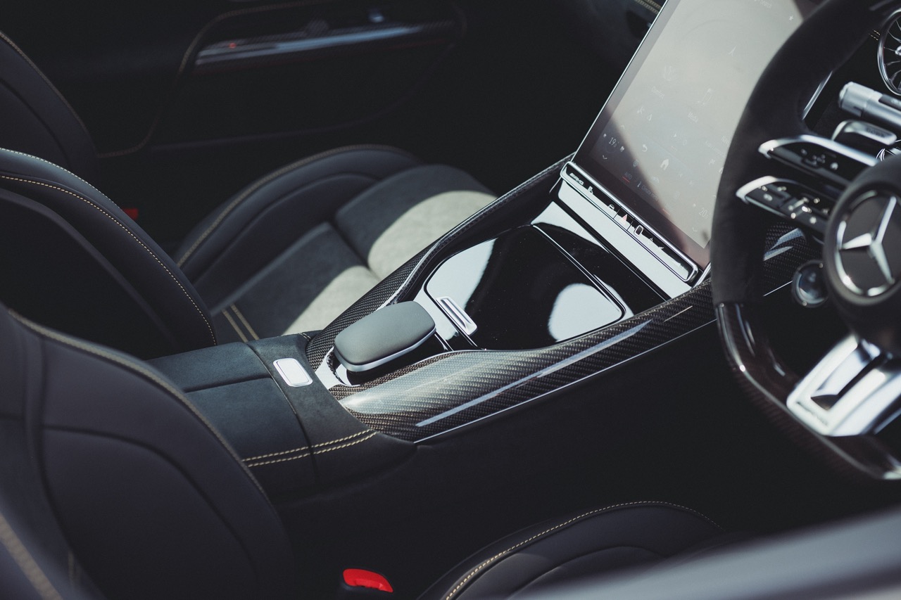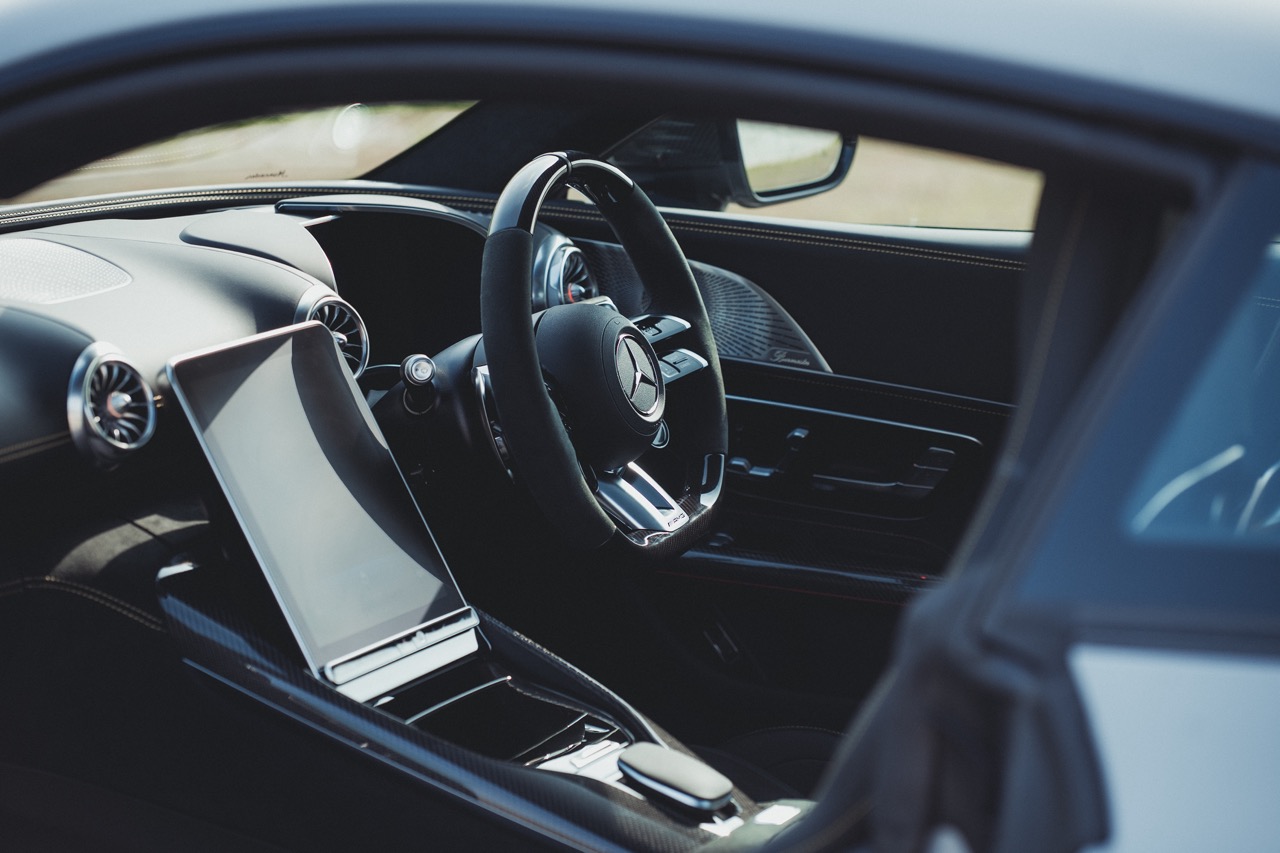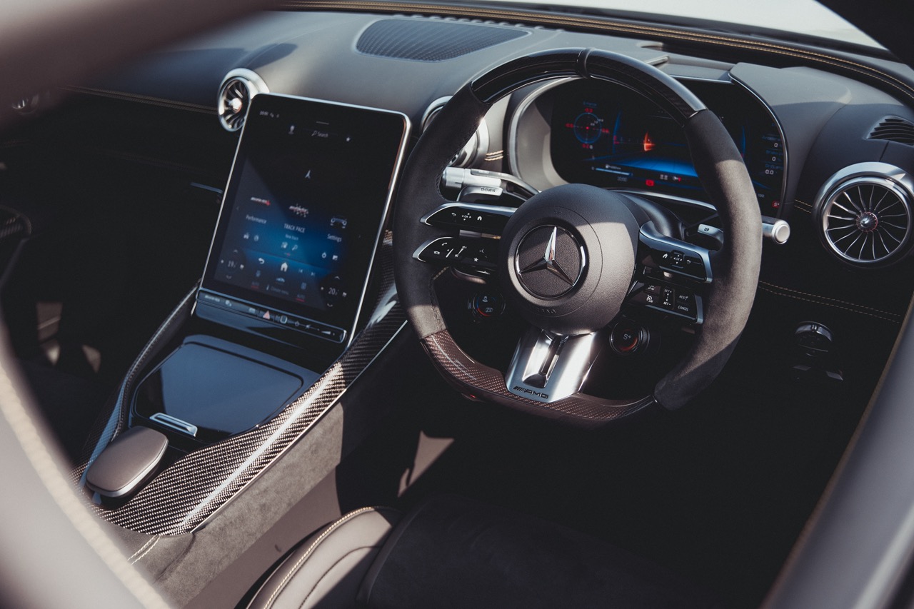 Finally moving along inside now, this second-iteration GT now offers a 2+2 layout and a boot large enough for a pair of golf bags. Yet the cabin remains unapologetically driver-centred, with deep AMG Performance seats and a flat-bottom steering wheel clad in carbon fibre and MICROCUT microfibre. An 11.9-inch portrait touchscreen running the latest MBUX anchors the centre stack, while a 12.3-inch digital cluster delivers five AMG-specific themes and can project key information via an optional head-up display.