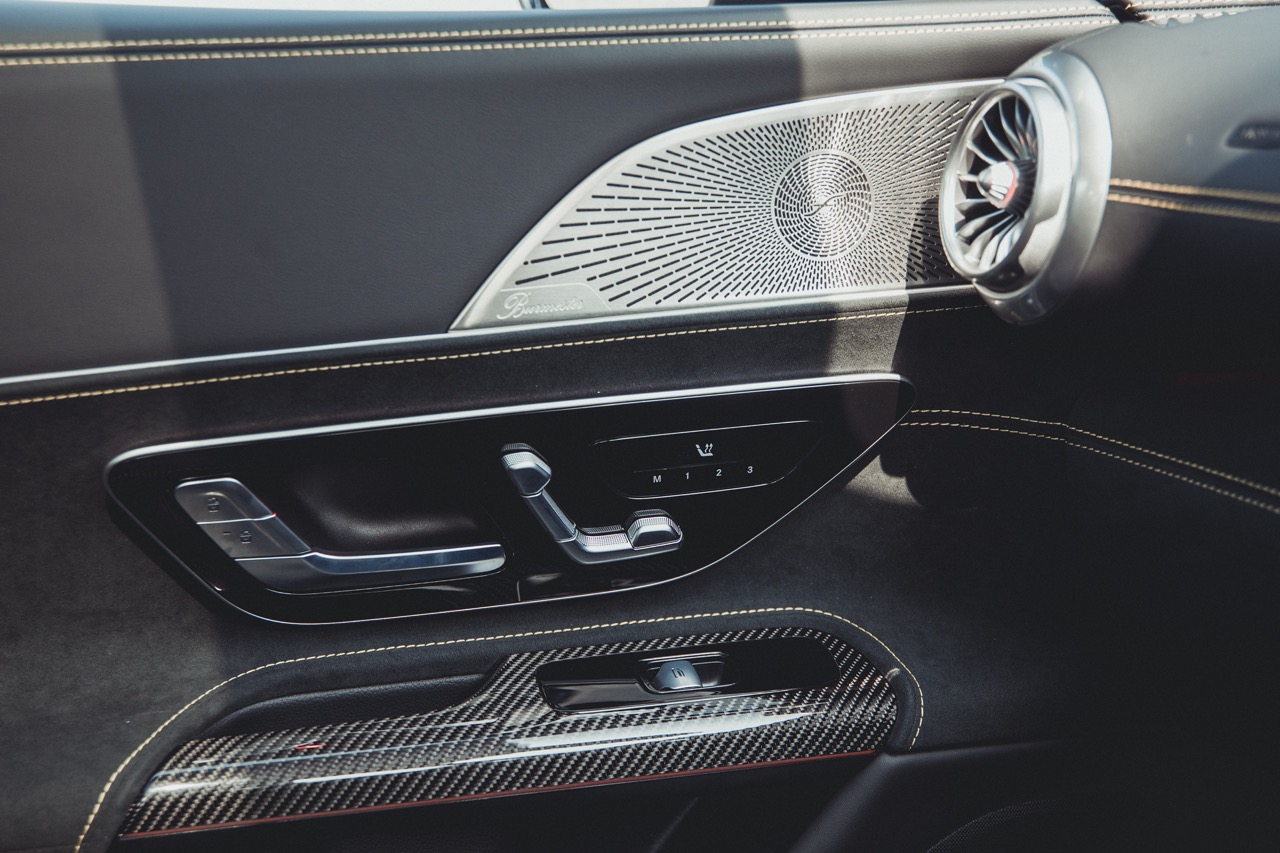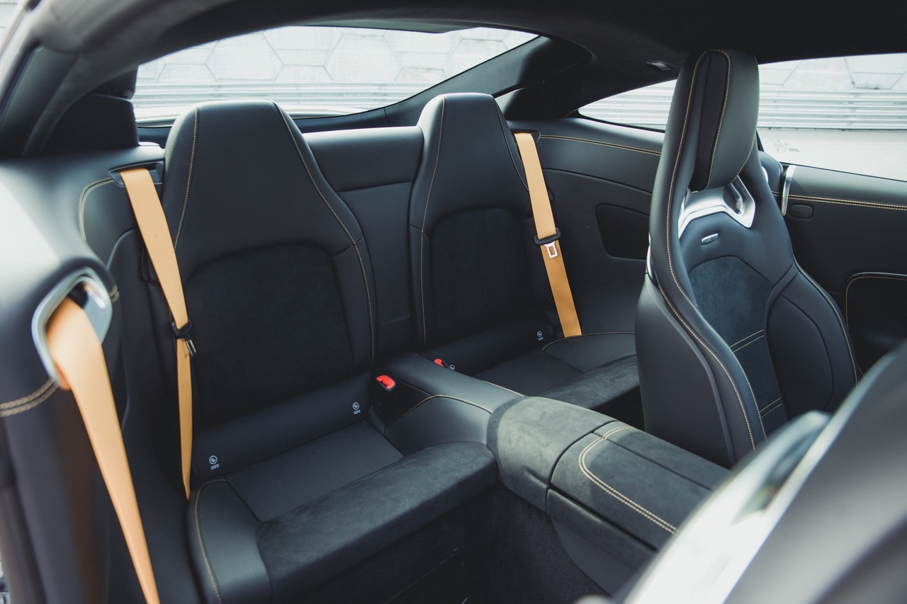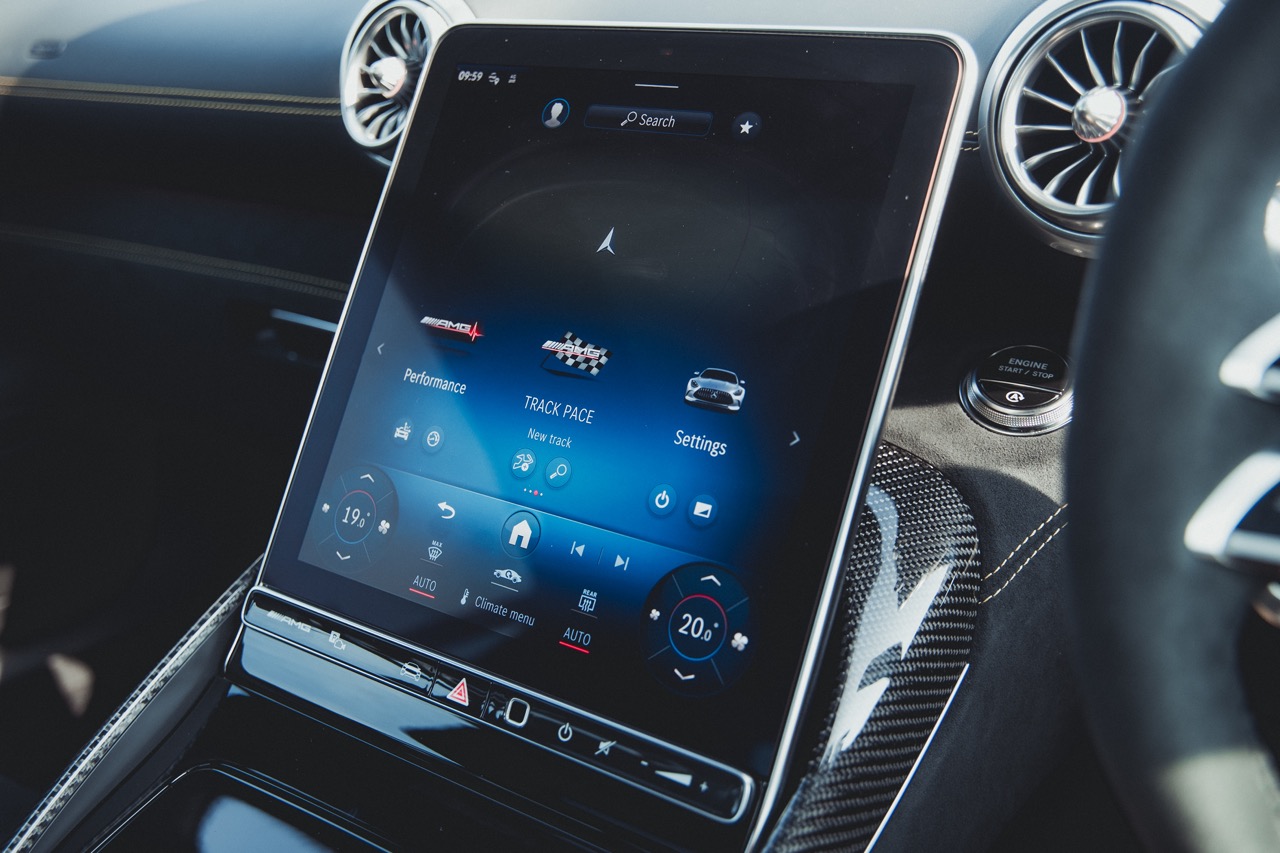 Finally moving along inside now, this second-iteration GT now offers a 2+2 layout and a boot large enough for a pair of golf bags. Yet the cabin remains unapologetically driver-centred, with deep AMG Performance seats and a flat-bottom steering wheel clad in carbon fibre and MICROCUT microfibre. An 11.9-inch portrait touchscreen running the latest MBUX anchors the centre stack, while a 12.3-inch digital cluster delivers five AMG-specific themes and can project key information via an optional head-up display.