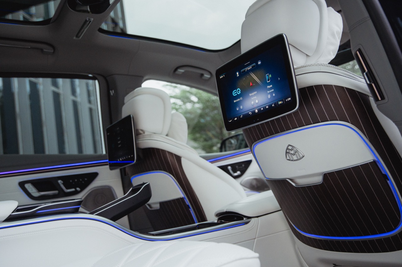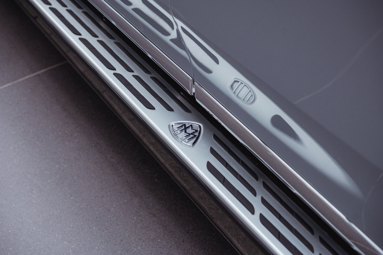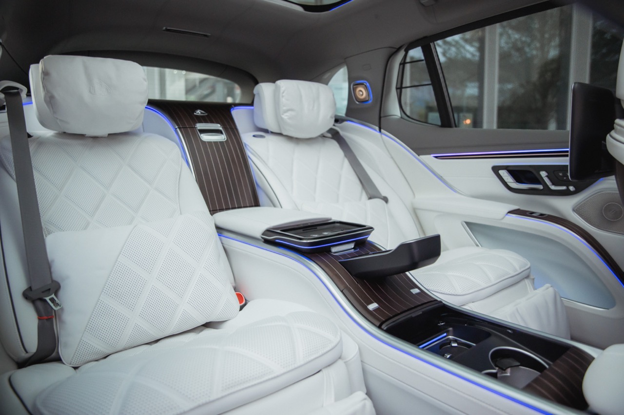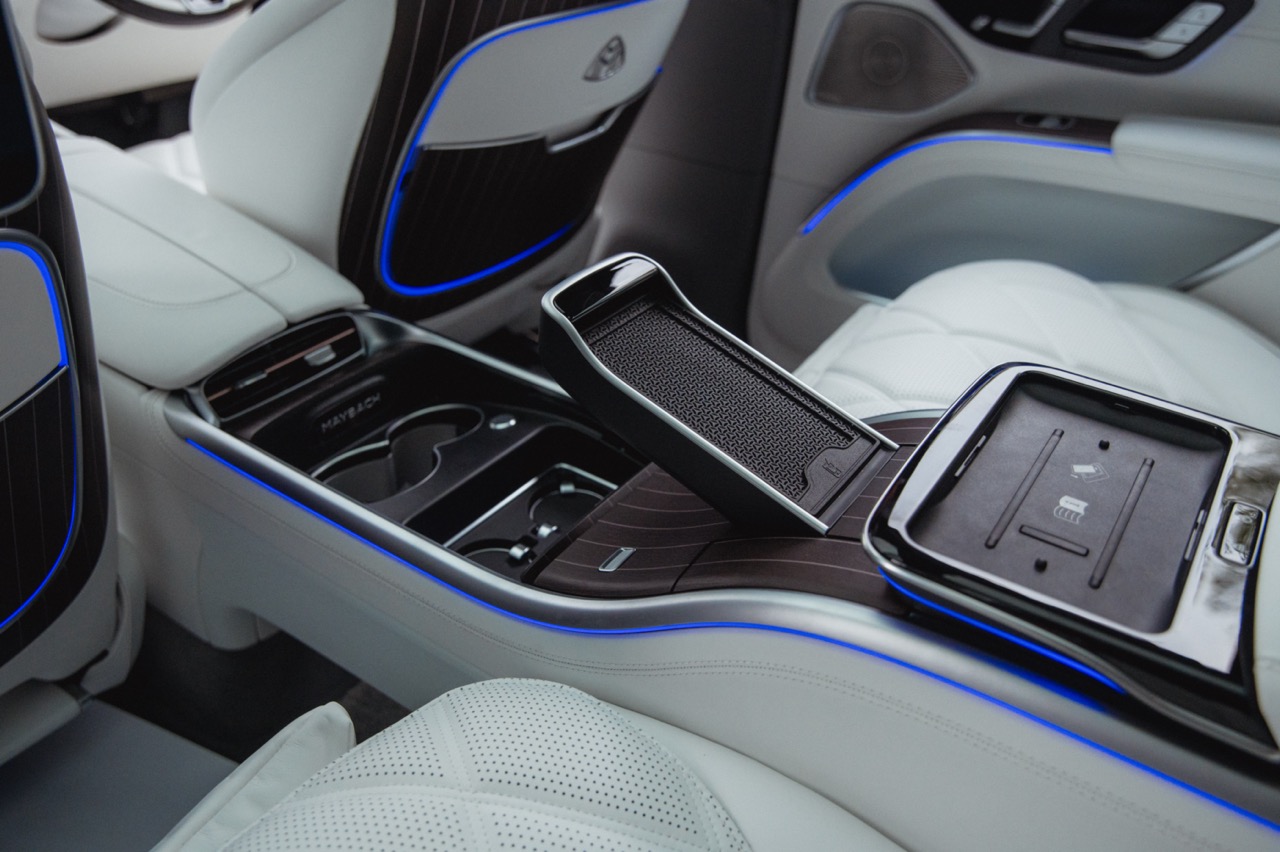 Differentiating this Maybach from the standard EQS down its flank meanwhile comes courtesy of a standard two-tone paint scheme, complemented by a hand-painted filigree pinstripe. The Maybach emblem on the D-pillar and bespoke 21-inch Maybach multi-spoke alloy wheels that is positioned between illuminated running boards add further distinction along its profile, while a full-width LED light bar with a two-part helix design completes the elegant exterior.