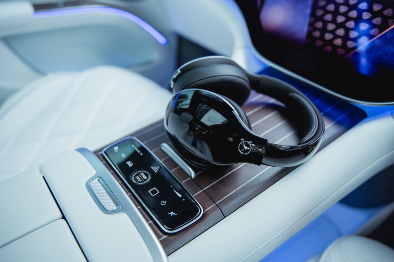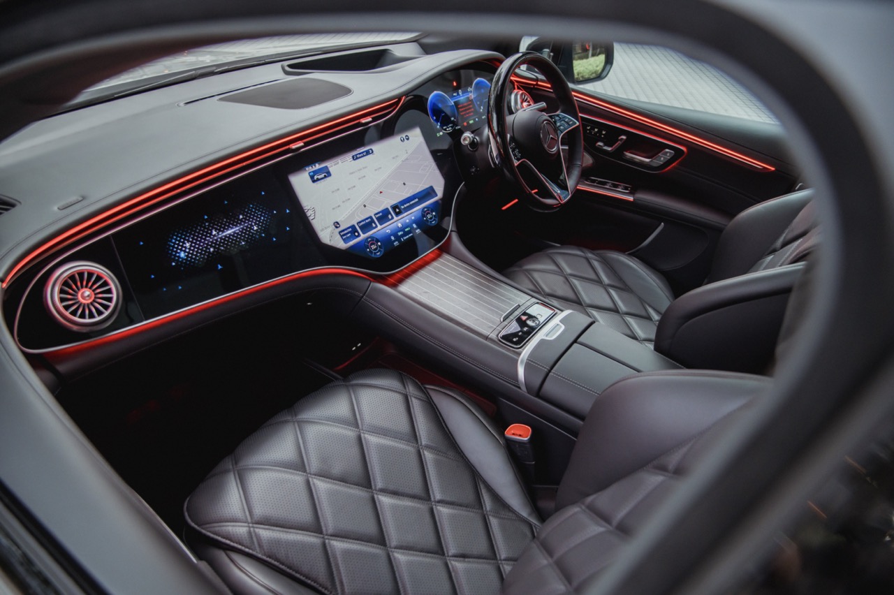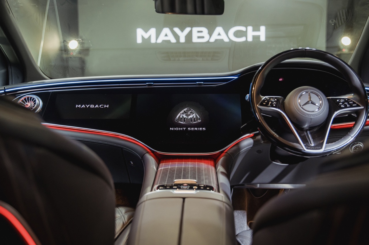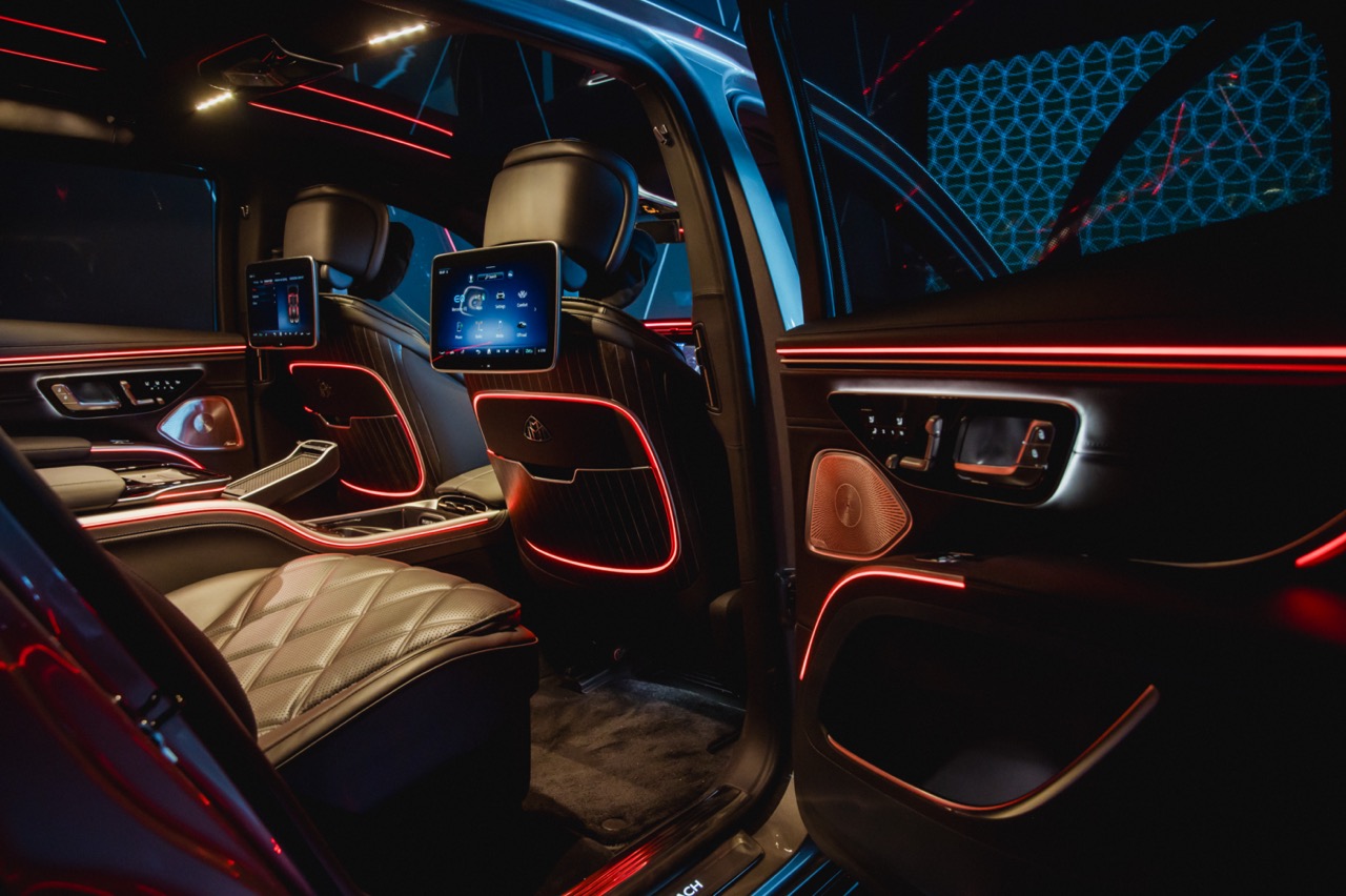 Differentiating this Maybach from the standard EQS down its flank meanwhile comes courtesy of a standard two-tone paint scheme, complemented by a hand-painted filigree pinstripe. The Maybach emblem on the D-pillar and bespoke 21-inch Maybach multi-spoke alloy wheels that is positioned between illuminated running boards add further distinction along its profile, while a full-width LED light bar with a two-part helix design completes the elegant exterior.
