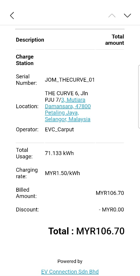 Wrong! JomCharge somehow managed to underestimate how much it costed to charge throughout the entire duration of the charge, to the point that even in its charging session summary it stated that the total charge costed RM 76.38. And this was really what we pretty much believed it costed, until an email that showed the final amount as being RM 106.70, which pretty much was the fly what has been a pretty shitty public charging experience!