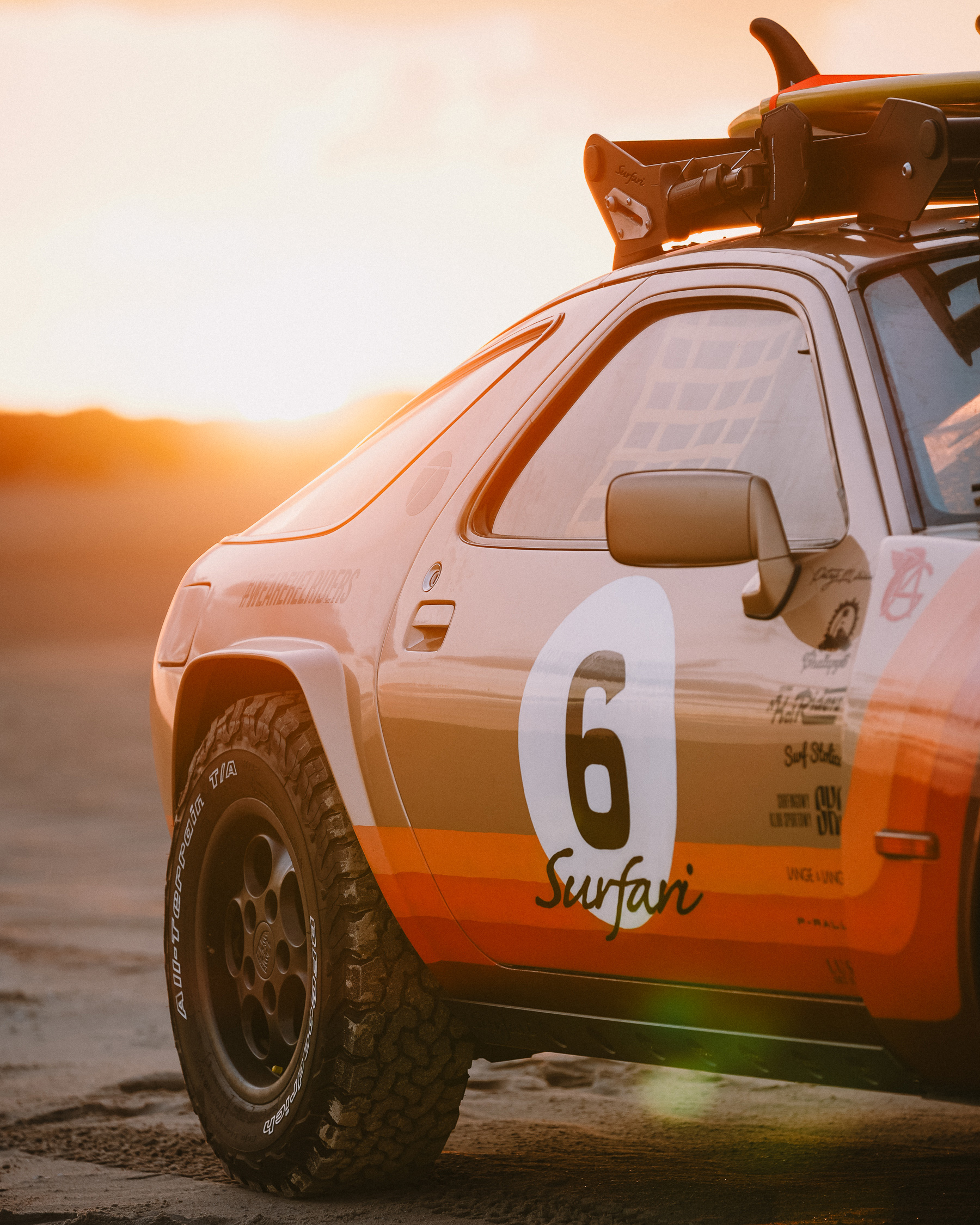 Some discrete underbody armour can further be spotted just poking through from under the snout of the 928 Surfari, with a winch and a set of spotlights appearing up front as well. Additional auxiliary illumination meanwhile is to be provided by an extra set of lights mounted on its custom roof rack, which holds too a set of specially-liveried surfboards that matches the car.
